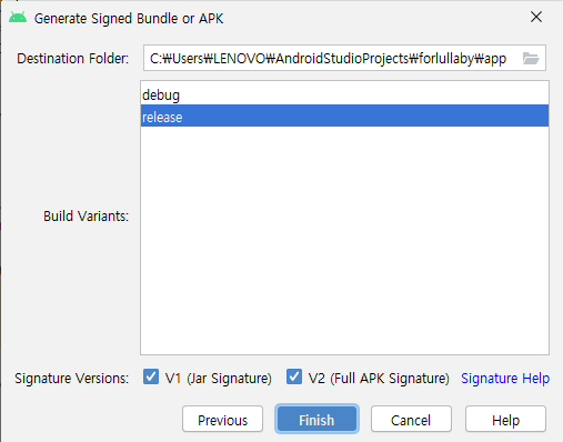 4. release, V1, V2를 선택하고 Finish를 실행합니다.