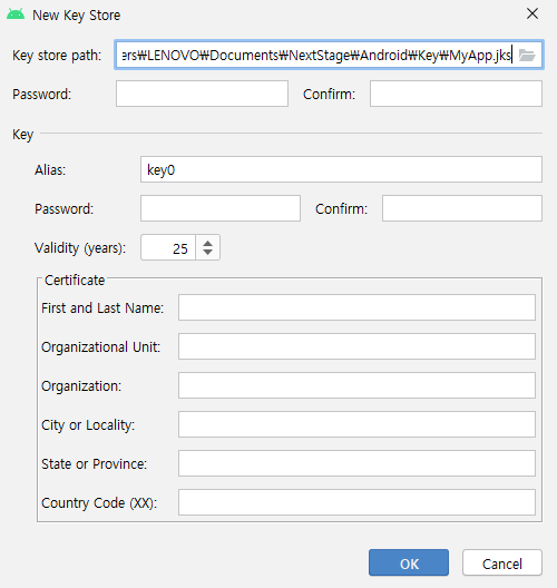 3. Package의 검증을 위해 인증서가 필요한데 기존에 인증서가 있다면 선택하고, 없다면 새로 만들어 주면 됩니다.